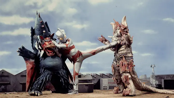 主題歌のテレビサイズが流れる中で、エースが二大超獣と激闘を繰り広げる!